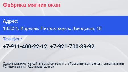 Фабрика мягких окон по адресу 185031, Карелия, Петрозаводск, Заводская, 18 в дальнейшем Организация, размещена в следующих категориях: