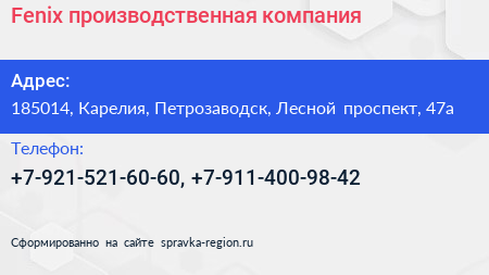 Fenix, производственная компания по адресу 185014, Карелия, Петрозаводск, Лесной проспект, 47а в дальнейшем Организация, размещена в следующих категориях: