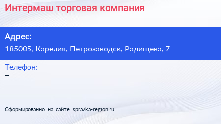 Интермаш, торговая компания по адресу 185005, Карелия, Петрозаводск, Радищева, 7 в дальнейшем Организация, размещена в следующих категориях: