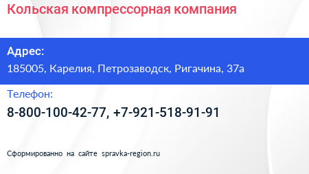 Кольская компрессорная компания по адресу 185005, Карелия, Петрозаводск, Ригачина, 37а в дальнейшем Организация, размещена в следующих категориях:
