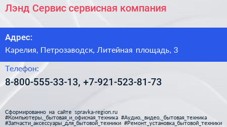 Лэнд-Сервис, сервисная компания по адресу Карелия, Петрозаводск, Литейная площадь, 3 в дальнейшем Организация, размещена в следующих категориях: