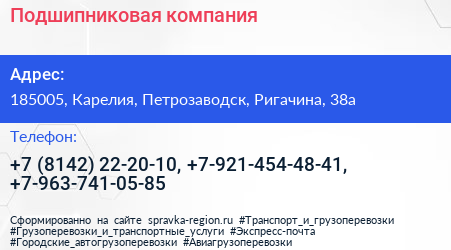 Подшипниковая компания по адресу 185005, Карелия, Петрозаводск, Ригачина, 38а в дальнейшем Организация, размещена в следующих категориях: