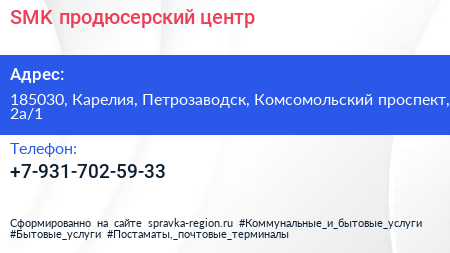 SMK, продюсерский центр по адресу 185030, Карелия, Петрозаводск, Комсомольский проспект, 2а/1 в дальнейшем Организация, размещена в следующих категориях: