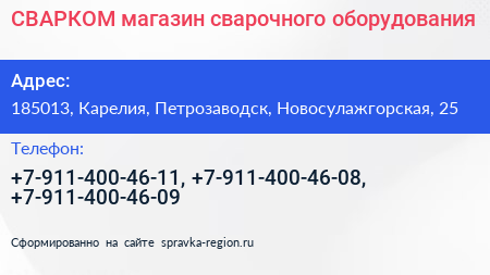 СВАРКОМ, магазин сварочного оборудования по адресу 185013, Карелия, Петрозаводск, Новосулажгорская, 25 в дальнейшем Организация, размещена в следующих категориях: