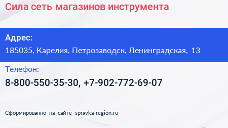 Сила, сеть магазинов инструмента по адресу 185035, Карелия, Петрозаводск, Ленинградская, 13 в дальнейшем Организация, размещена в следующих категориях: