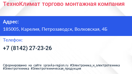 ТехноКлимат, торгово-монтажная компания по адресу 185005, Карелия, Петрозаводск, Волховская, 4Б в дальнейшем Организация, размещена в следующих категориях:
