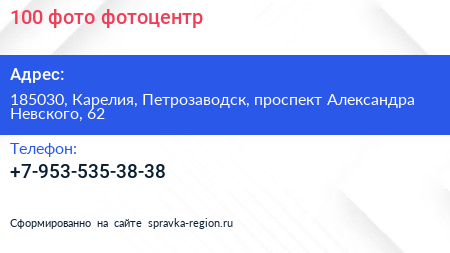 100 фото, фотоцентр по адресу 185030, Карелия, Петрозаводск, проспект Александра Невского, 62 в дальнейшем Организация, размещена в следующих категориях: