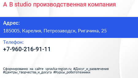 A & B studio, производственная компания по адресу 185005, Карелия, Петрозаводск, Ригачина, 25 в дальнейшем Организация, размещена в следующих категориях: