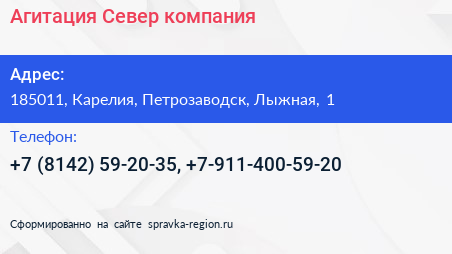 Агитация Север, компания по адресу 185011, Карелия, Петрозаводск, Лыжная, 1 в дальнейшем Организация, размещена в следующих категориях: