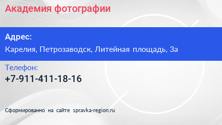 Академия фотографии по адресу Карелия, Петрозаводск, Литейная площадь, 3а в дальнейшем Организация, размещена в следующих категориях:
