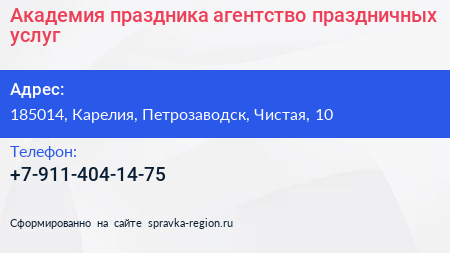Академия праздника, агентство праздничных услуг по адресу 185014, Карелия, Петрозаводск, Чистая, 10 в дальнейшем Организация, размещена в следующих категориях:
