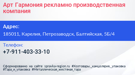 Арт-Гармония, рекламно-производственная компания по адресу 185011, Карелия, Петрозаводск, Балтийская, 5Б/4 в дальнейшем Организация, размещена в следующих категориях: