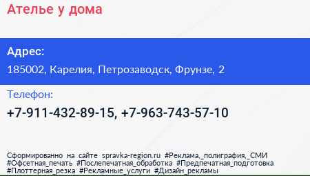 Ателье у дома по адресу 185002, Карелия, Петрозаводск, Фрунзе, 2 в дальнейшем Организация, размещена в следующих категориях: