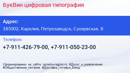 БукВин, цифровая типография по адресу 185002, Карелия, Петрозаводск, Суоярвская, 8 в дальнейшем Организация, размещена в следующих категориях:
