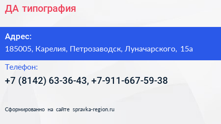 ДА, типография по адресу 185005, Карелия, Петрозаводск, Луначарского, 15а в дальнейшем Организация, размещена в следующих категориях: