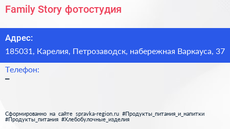 Family Story, фотостудия по адресу 185031, Карелия, Петрозаводск, набережная Варкауса, 37 в дальнейшем Организация, размещена в следующих категориях: