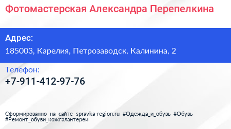 Фотомастерская Александра Перепелкина по адресу 185003, Карелия, Петрозаводск, Калинина, 2 в дальнейшем Организация, размещена в следующих категориях: