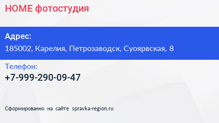 HOME, фотостудия по адресу 185002, Карелия, Петрозаводск, Суоярвская, 8 в дальнейшем Организация, размещена в следующих категориях: