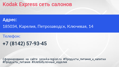 Kodak Express, сеть салонов по адресу 185034, Карелия, Петрозаводск, Ключевая, 14 в дальнейшем Организация, размещена в следующих категориях: