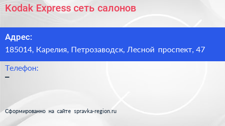 Kodak Express, сеть салонов по адресу 185014, Карелия, Петрозаводск, Лесной проспект, 47 в дальнейшем Организация, размещена в следующих категориях: