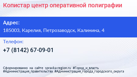 Копистар, центр оперативной полиграфии по адресу 185003, Карелия, Петрозаводск, Калинина, 4 в дальнейшем Организация, размещена в следующих категориях: