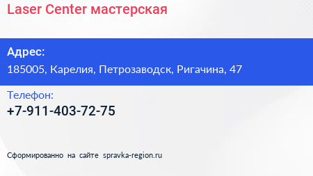 Laser Center, мастерская по адресу 185005, Карелия, Петрозаводск, Ригачина, 47 в дальнейшем Организация, размещена в следующих категориях: