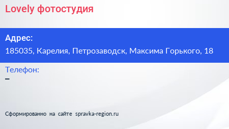 Lovely, фотостудия по адресу 185035, Карелия, Петрозаводск, Максима Горького, 18 в дальнейшем Организация, размещена в следующих категориях: