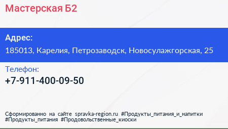 Мастерская Б2 по адресу 185013, Карелия, Петрозаводск, Новосулажгорская, 25 в дальнейшем Организация, размещена в следующих категориях: