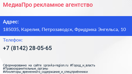 МедиаПро, рекламное агентство по адресу 185035, Карелия, Петрозаводск, Фридриха Энгельса, 10 в дальнейшем Организация, размещена в следующих категориях: