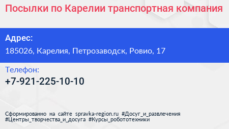 Посылки по Карелии, транспортная компания по адресу 185026, Карелия, Петрозаводск, Ровио, 17 в дальнейшем Организация, размещена в следующих категориях: