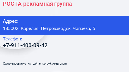 РОСТА, рекламная группа по адресу 185002, Карелия, Петрозаводск, Чапаева, 5 в дальнейшем Организация, размещена в следующих категориях: