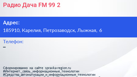 Радио Дача, FM 99.2 по адресу 185910, Карелия, Петрозаводск, Лыжная, 6 в дальнейшем Организация, размещена в следующих категориях: