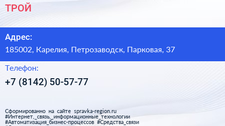 ТРОЙ по адресу 185002, Карелия, Петрозаводск, Парковая, 37 в дальнейшем Организация, размещена в следующих категориях: