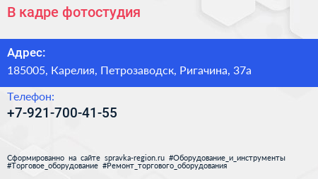 В кадре, фотостудия по адресу 185005, Карелия, Петрозаводск, Ригачина, 37а в дальнейшем Организация, размещена в следующих категориях: