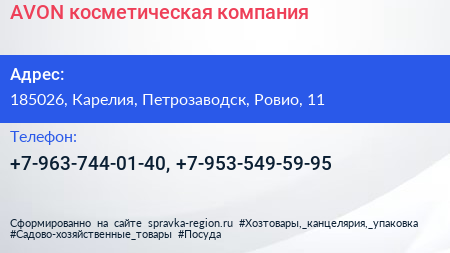 AVON, косметическая компания по адресу 185026, Карелия, Петрозаводск, Ровио, 11 в дальнейшем Организация, размещена в следующих категориях: