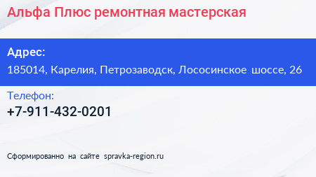 Альфа Плюс, ремонтная мастерская по адресу 185014, Карелия, Петрозаводск, Лососинское шоссе, 26 в дальнейшем Организация, размещена в следующих категориях: