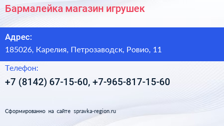Бармалейка, магазин игрушек по адресу 185026, Карелия, Петрозаводск, Ровио, 11 в дальнейшем Организация, размещена в следующих категориях: