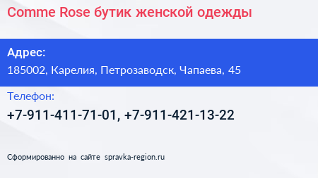 Comme Rose, бутик женской одежды по адресу 185002, Карелия, Петрозаводск, Чапаева, 45 в дальнейшем Организация, размещена в следующих категориях: