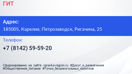ГИТ по адресу 185005, Карелия, Петрозаводск, Ригачина, 25 в дальнейшем Организация, размещена в следующих категориях: