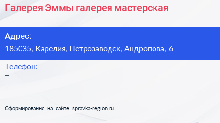 Галерея Эммы, галерея-мастерская по адресу 185035, Карелия, Петрозаводск, Андропова, 6 в дальнейшем Организация, размещена в следующих категориях: