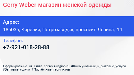 Gerry Weber, магазин женской одежды по адресу 185035, Карелия, Петрозаводск, проспект Ленина, 14 в дальнейшем Организация, размещена в следующих категориях: