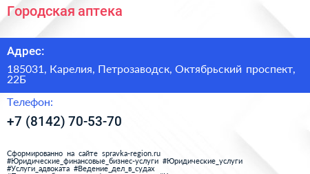Городская аптека по адресу 185031, Карелия, Петрозаводск, Октябрьский проспект, 22Б в дальнейшем Организация, размещена в следующих категориях: