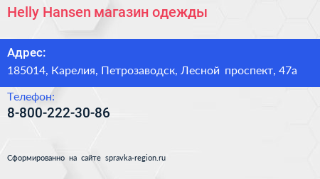 Helly Hansen, магазин одежды по адресу 185014, Карелия, Петрозаводск, Лесной проспект, 47а в дальнейшем Организация, размещена в следующих категориях:
