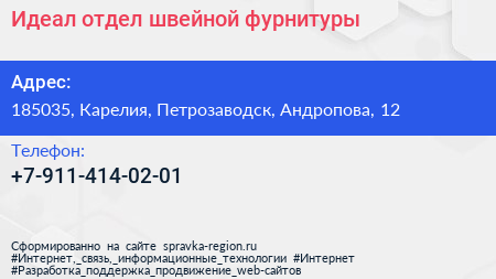 Идеал, отдел швейной фурнитуры по адресу 185035, Карелия, Петрозаводск, Андропова, 12 в дальнейшем Организация, размещена в следующих категориях:
