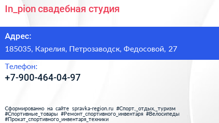 In_pion, свадебная студия по адресу 185035, Карелия, Петрозаводск, Федосовой, 27 в дальнейшем Организация, размещена в следующих категориях: