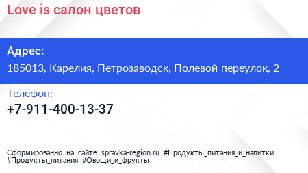 Love is, салон цветов по адресу 185013, Карелия, Петрозаводск, Полевой переулок, 2 в дальнейшем Организация, размещена в следующих категориях: