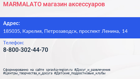 MARMALATO, магазин аксессуаров по адресу 185035, Карелия, Петрозаводск, проспект Ленина, 14 в дальнейшем Организация, размещена в следующих категориях: