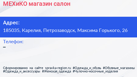 МЕХиКО, магазин-салон по адресу 185035, Карелия, Петрозаводск, Максима Горького, 26 в дальнейшем Организация, размещена в следующих категориях: