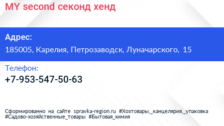 MY second, секонд-хенд по адресу 185005, Карелия, Петрозаводск, Луначарского, 15 в дальнейшем Организация, размещена в следующих категориях:
