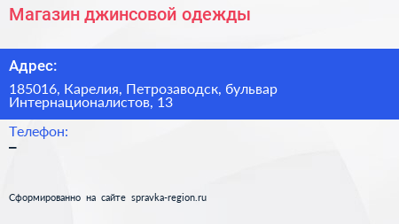 Магазин джинсовой одежды по адресу 185016, Карелия, Петрозаводск, бульвар Интернационалистов, 13 в дальнейшем Организация, размещена в следующих категориях: